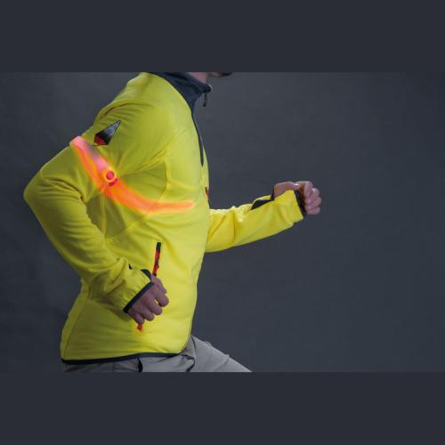 LED arm band with reflecting stripes, can be easily attached to the upper arm thanks to the flexible rubber band with velcro closure. By pushing the black button the two red LEDs will be activated, still light or blinking can be set up.