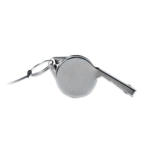 Metal whistle attached to lanyard with safety buckle.