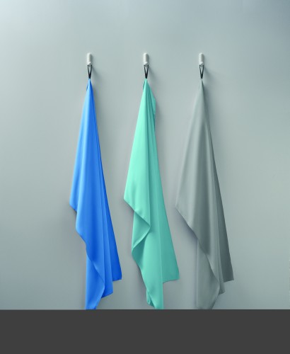 Double sided velvet microfibre sports/beach towel 200 gr/m² with snap button strap closure.