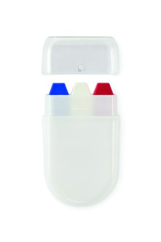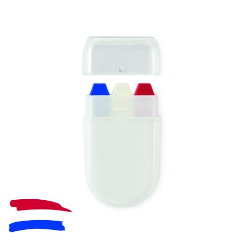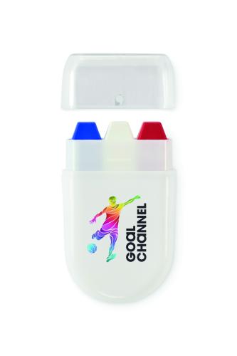 Body paint stick in national flag colours with wax paint in PP case and PS lid.