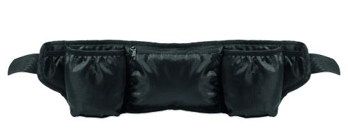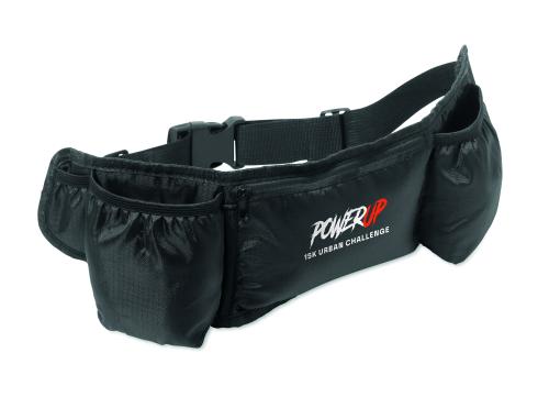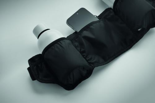 Sports running and hiking waist bag made of 420D RPET polyester with mesh back. Features two bottle compartments, central zip pocket, and adjustable strap. Lightweight and durable.