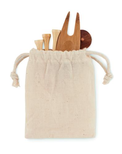 Golf accessories in bamboo including 6 golf tees, 1 piece golf divot and 2 golf wooden ball markers all presented in an organic cotton drawstring bag. Bamboo is a natural product, there may be slight variations in colour and size per item, which can affect the final decoration outcome.