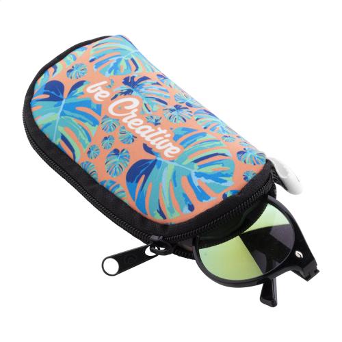 Custom made, RPET neoprene sunglasses case with zipped compartment. With all over sublimation printed graphics and distinctive RPET label. Price includes sublimation printing. MOQ: 50 pcs.