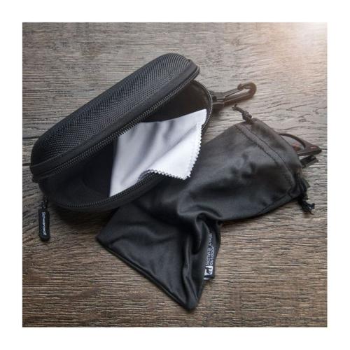 Schwarzwolf hard case for sunglasses. The case is made of black canvas and velvet material. The case has a zipper with Schwarzwolf logo on the zipper slider. The case includes a black microfibre pouch and a white microfibre cleaning cloth suitable for sublimation. Packed in a gift box.