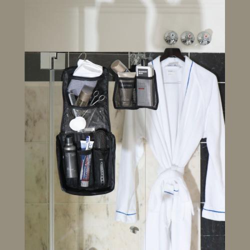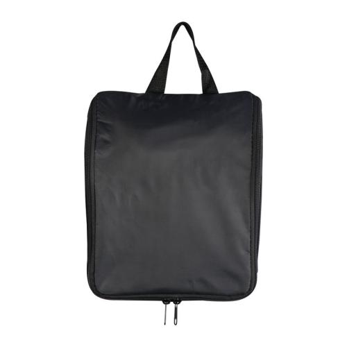 High-quality polyester toilet bag with a metal hook and several compartments. We will print your logo on the bag.