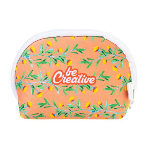 Custom made, zipped cosmetic bag in RPET neoprene. With distinctive RPET label and all over sublimation printed graphics. MOQ: 50 pcs.