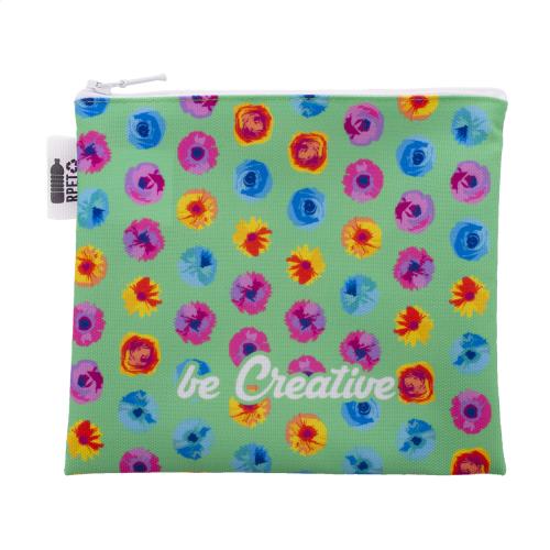Custom made, zipped cosmetic bag in 600D RPET polyester. With all-over sublimation printed graphics. MOQ: 50 pcs.
