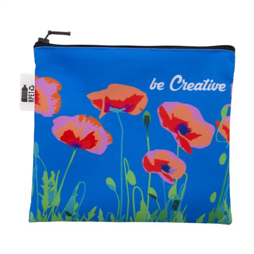 Custom made, zipped cosmetic bag in 600D RPET polyester. With all-over sublimation printed graphics. MOQ: 50 pcs.