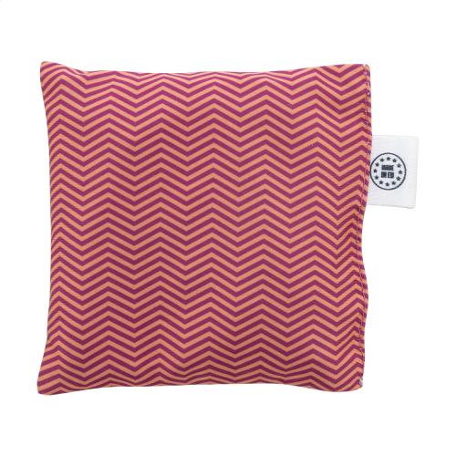 Custom made, RPET microfibre covered cherry stone heat pack pillow. In compact size designed for use on the ears. With all-over sublimation printed graphics and distinctive RPET label. MOQ: 50 pcs.