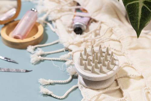 Ecological wheat straw plastic scalp massager with silicone bristles. Ideal for stimulating circulation and enhancing shampoo distribution during hair wash.