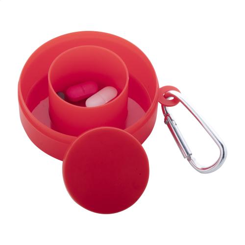Recycled PP plastic foldable cup with pillbox compartment and metal carabiner. 220 ml. BPA-free.