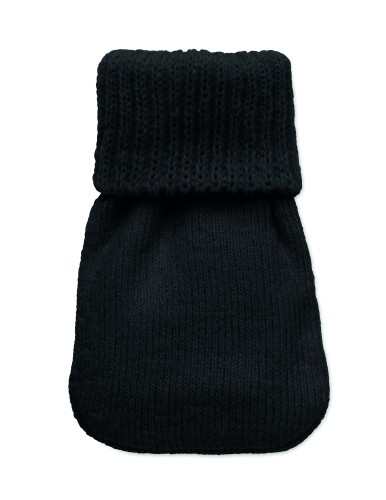 Hand warmer in knitted polyester. Includes instant heat pad in PVC to be activated by pressing the metal plate inside. Reusable by placing pad in hot water.