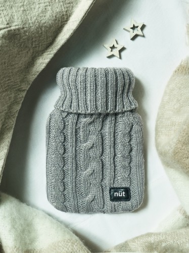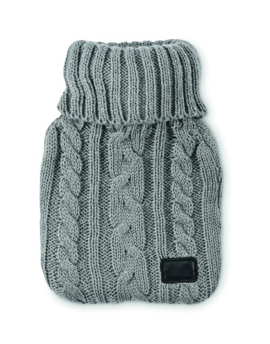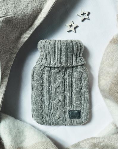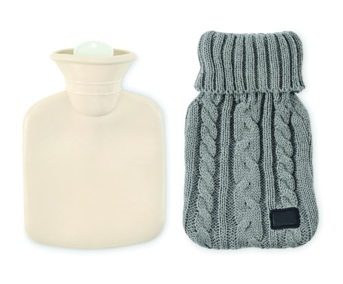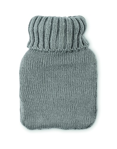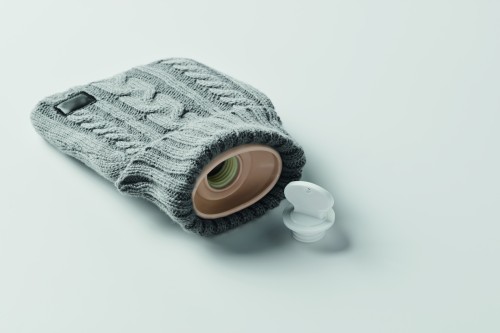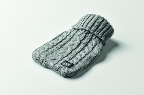 Hot water bottle with knitted acrylic pouch. Used to provide warmth, typically whilst in bed, but also for the application of heat to a specific part of the body. Capacity: 400 ml.