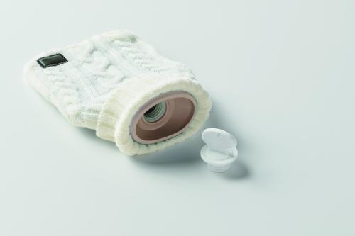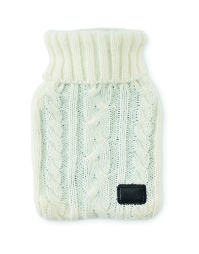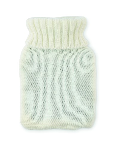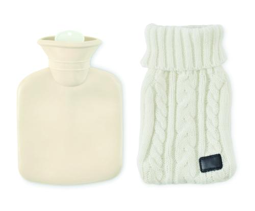 Hot water bottle with knitted acrylic pouch. Used to provide warmth, typically whilst in bed, but also for the application of heat to a specific part of the body. Capacity: 400 ml.
