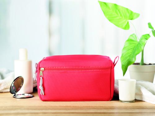 Cosmetic bag with double zipper. 600D polyester with PPE backing.