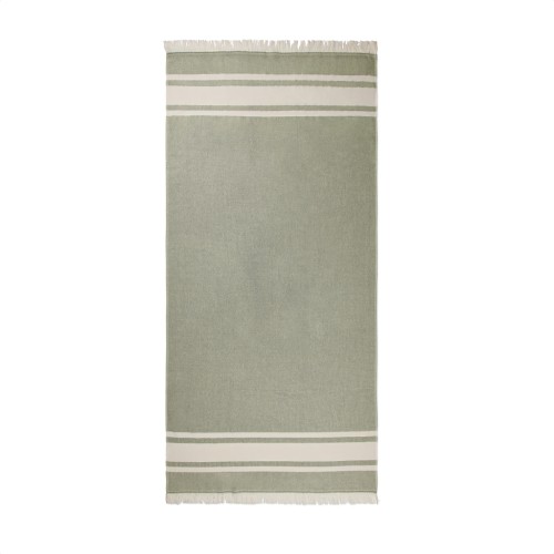 Hammam towel designed with two different types of texture, one side in terry and the other side in plain weave. The two-sided design makes this towel the ultimate companion when you're at the beach, by the pool, or when on an adventure outdoors. It has an excellent absorbency and dries up quickly. The towel is crafted from 75% cotton and 25% polyester and has a thickness of 360 gsm. Measurements: 180x80cm, fringes in 5cm excluded. OEKO-TEX® STANDARD 100. 09.HIN.68091. Hohenstein HTTI.