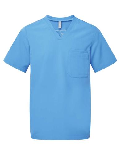 • V-neck style with left chest pocket
