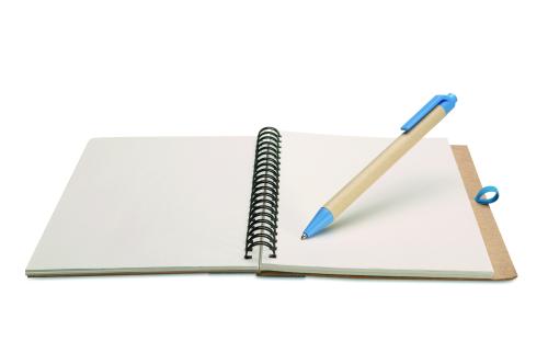 Recycled paper notebook with matching pen. Twin-wire. 140 plain recycled paper pages (70 sheets). Matching push button ball pen in recycled carton and biodegradable plastic. Blue ink. Matching elastic pen holder. FSC MIX CREDIT | P7.1 | FSC-C213206