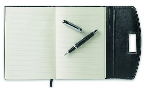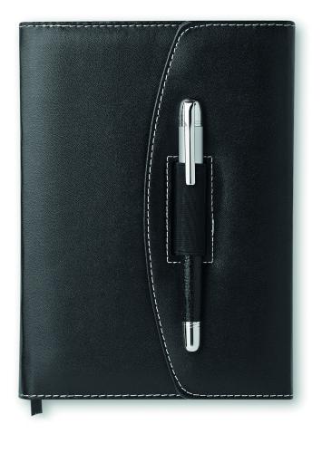 A5 PU notebook portfolio with contrast stiching and pen. 240 lined pages (120 sheets). Matching metal pen. Black ink.