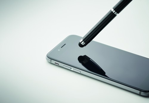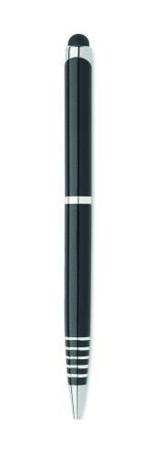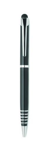 Twist action ball pen in recycled aluminium with stylus. Blue ink.