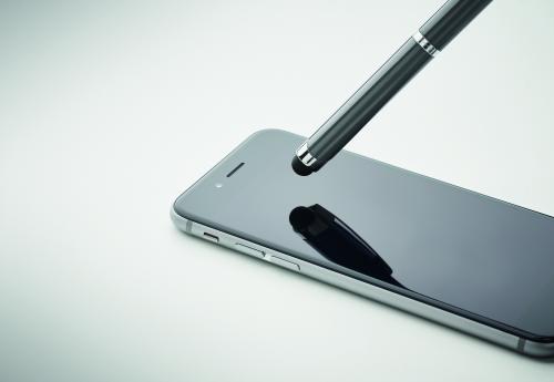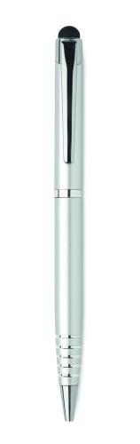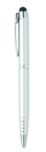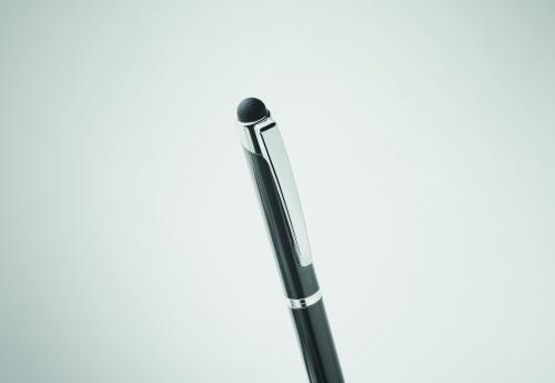 Twist action ball pen in recycled aluminium with stylus. Blue ink.