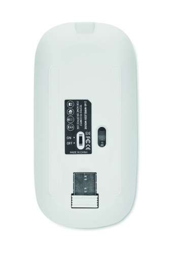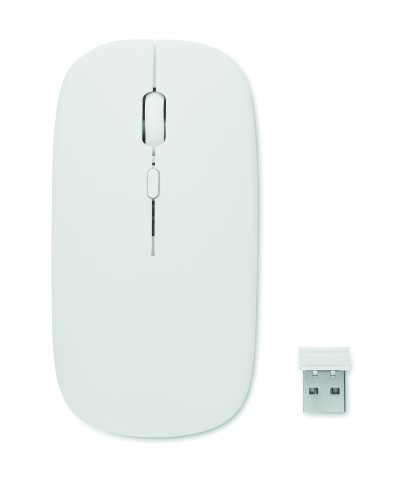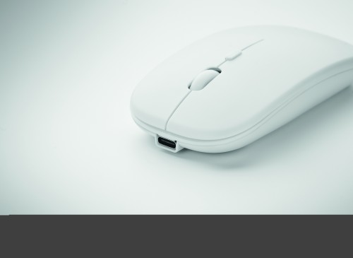 Wireless optical mouse in recycled ABS with USB rechargeable 500 mAh battery.