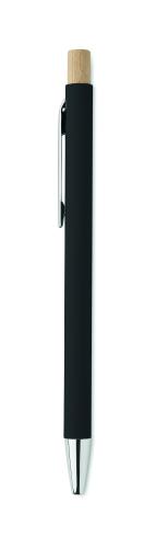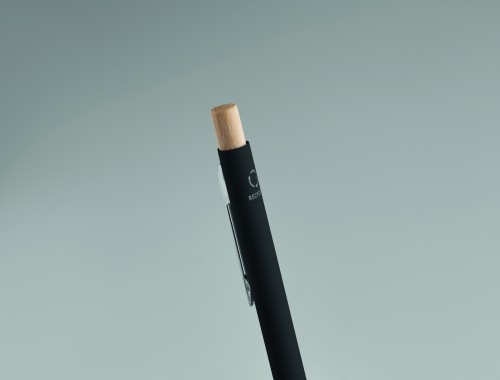 Recycled aluminium with bamboo push button. Silver tip and clip. Blue ink.