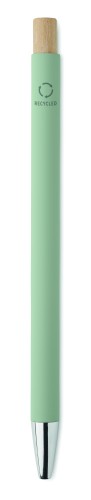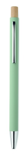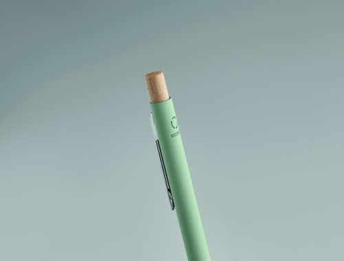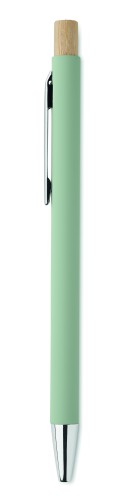 Recycled aluminium with bamboo push button. Silver tip and clip. Blue ink.