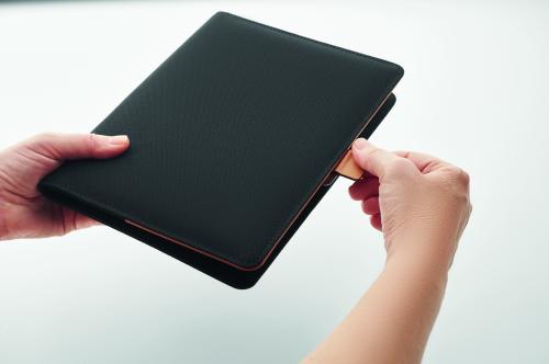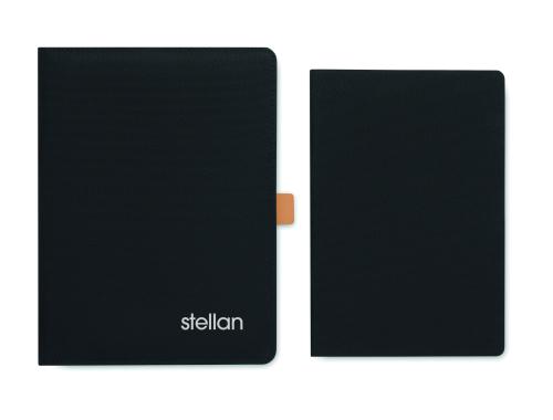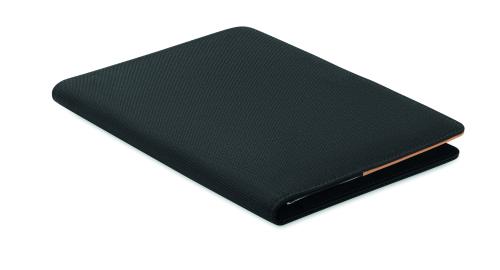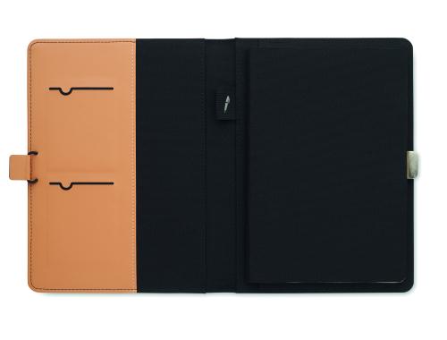 A5 portfolio in RPET with faux leather details. Replaceable A5 notebook with hard cork cover. Case bound. 128 recycled paper lined pages (64 sheets). Pen holder. 2 cardholders and one big compartment. Elastic closure strap with metal detail. FSC®-certified | FSC MIX, P8.6, FSC-C213206