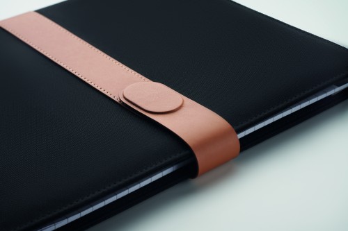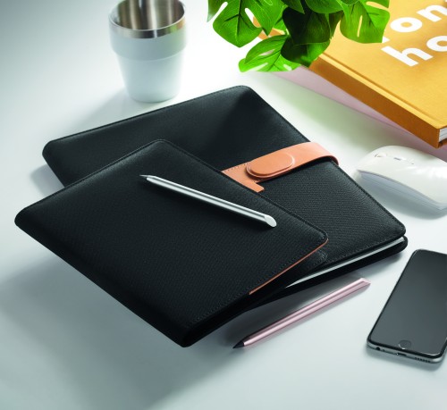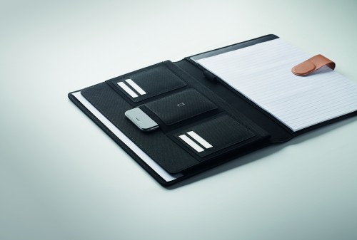 A4 portfolio in RPET with faux leather details. Replaceable A4 notepad.30 recycled paper lined pages. Pen holder. 4 cardholders, 3 small pockets and one big compartment. Magnetic strap closure. FSC®-certified | FSC MIX , P8.6, FSC-C213206
