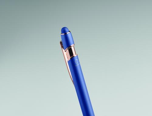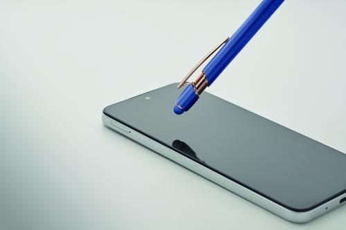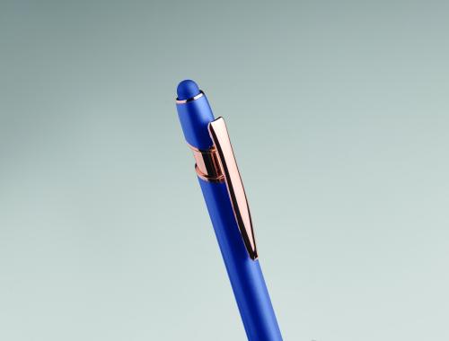 Recycled aluminium stylus push ball pen with rose gold details. Blue ink.