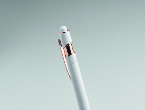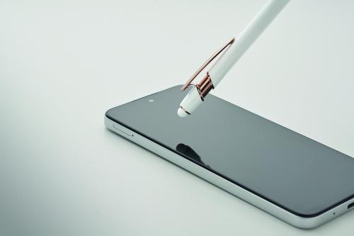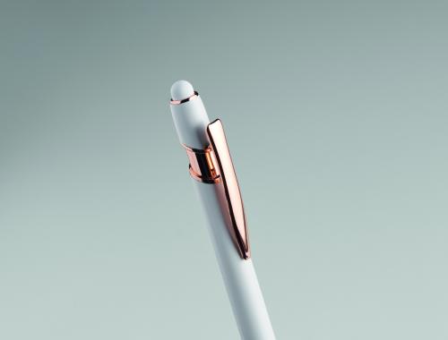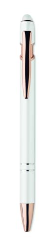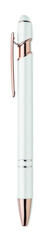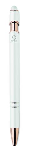 Recycled aluminium stylus push ball pen with rose gold details. Blue ink.