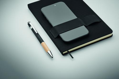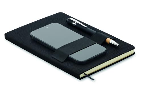 A5 notebook set with 600D RPET hard cover. Front elastic band phone holder function and front pen loop with push ball pen with bamboo grip detail. Case bound. 160 recycled paper lined pages (80 sheets). Includes envelope inside the back cover. Elastic closure strap. Ribbon bookmark. Blue ink. FSC®-certified | FSC MIX CREDIT, P7.1 , FSC-C213206