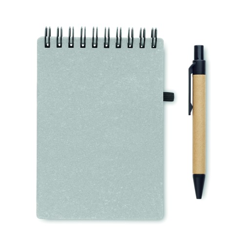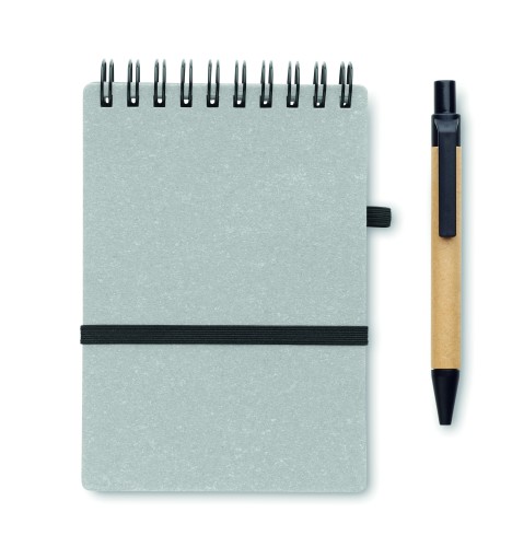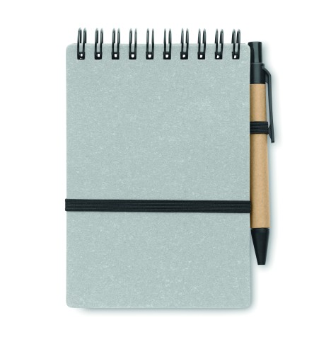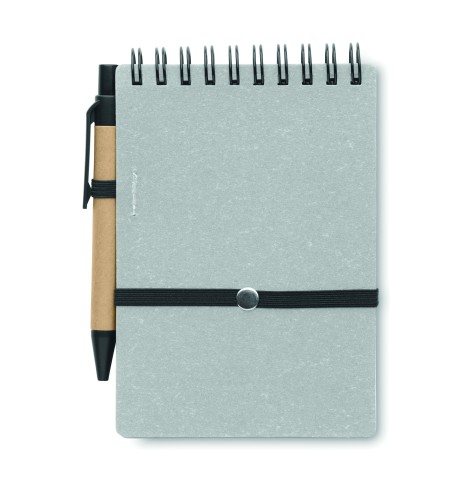 Recycled paper and PU cover (70% recycled paper and 30% PU) notebook. Twin-wire. 140 lined recycled paper pages (70 sheets). Matching push button ball pen in recycled carton and ABS parts. Blue ink. Elastic closure strap and pen holder. FSC®-certified | FSC MIX CREDIT, P7.1, FSC-C213206