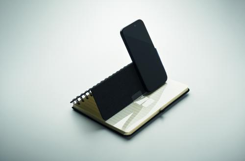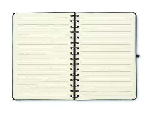 A5 notebook with 600D RPET hard cover with smartphone stand function. Twin-wire. 160 lined pages (80 sheets). 70 gsm recycled paper. Elastic closure strap.