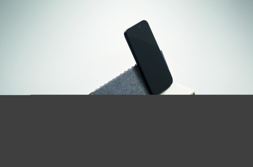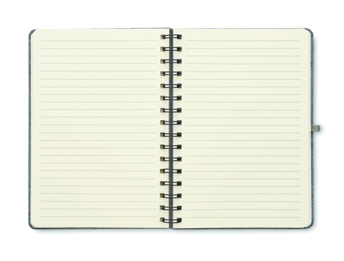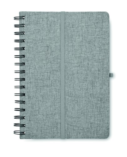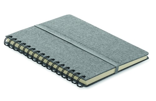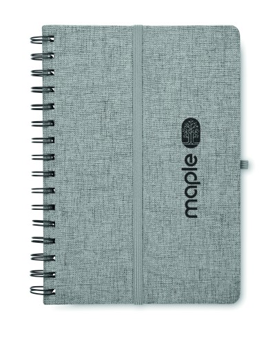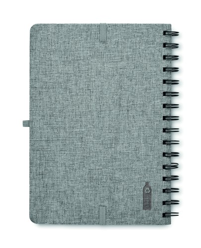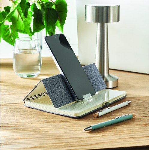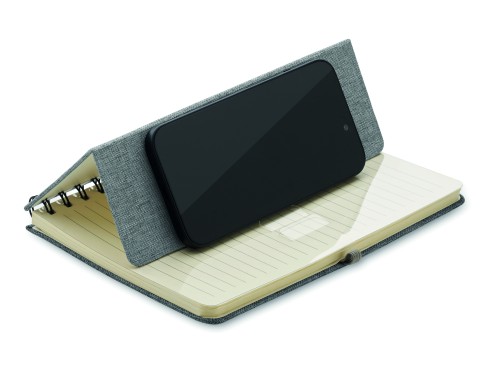 A5 notebook with 600D RPET hard cover with smartphone stand function. Twin-wire. 160 lined pages (80 sheets). 70 gsm recycled paper. Elastic closure strap.
