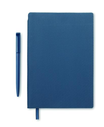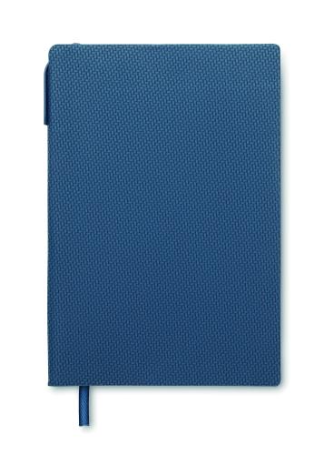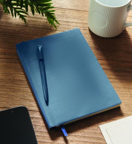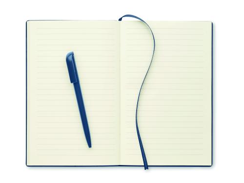 A5 notebook with structured PU cover with ABS twist ball pen inside spine pen holder. Case bound. 160 lined pages recycled paper (80 sheets).