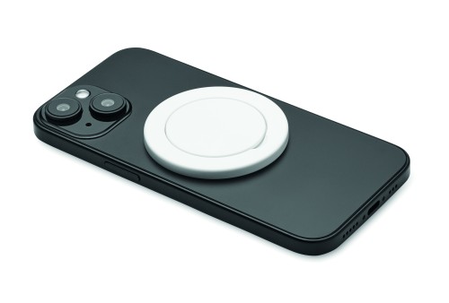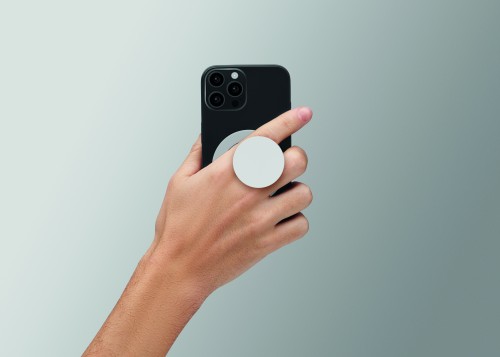 Magnetic phone holder and stand in recycled ABS. Includes additional metal ring to support non-magnetic phones.