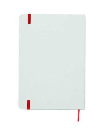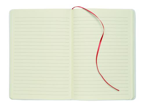 A5 notebook with hard cover made of 70% recycled milk carton pack and 30% recycled paper. White cover. Casebound. 160 lined recycled paper pages (80 sheets). Elastic closure strap, ribbon bookmark matching with revealed colour. After laser engraving the colour is revealed.