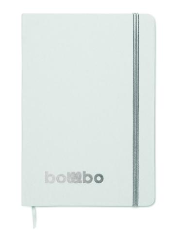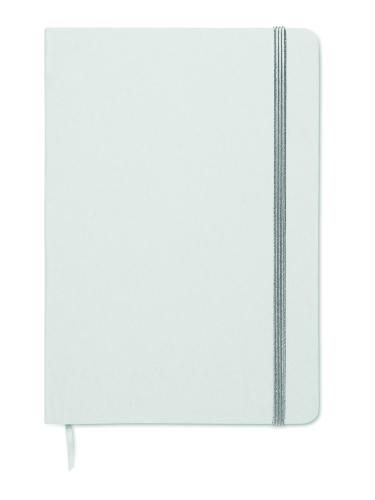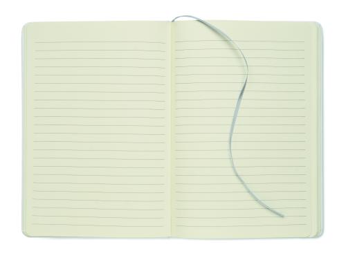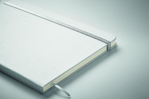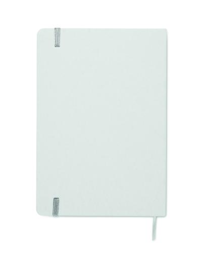 A5 notebook with hard cover made of 70% recycled milk carton pack and 30% recycled paper. White cover. Casebound. 160 lined recycled paper pages (80 sheets). Elastic closure strap, ribbon bookmark matching with revealed colour. After laser engraving the colour is revealed.