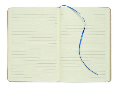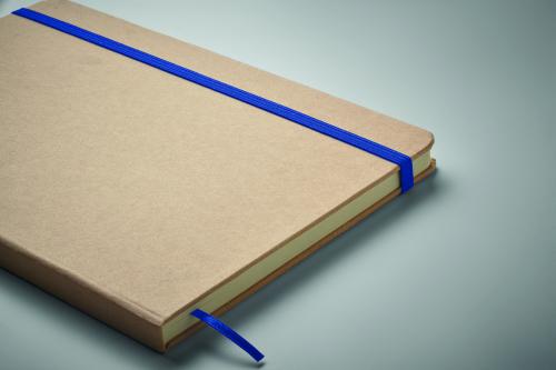 A5 notebook with hard recycled carton cover. Beige cover. Case bound. 160 lined recycled paper pages (80 sheets). Elastic closure strap, ribbon bookmark matching with revealed colour. After laser engraving the colour is revealed. FSC®-certified | FSC MIX CREDIT, P7.1, FSC-C213206