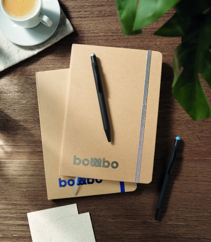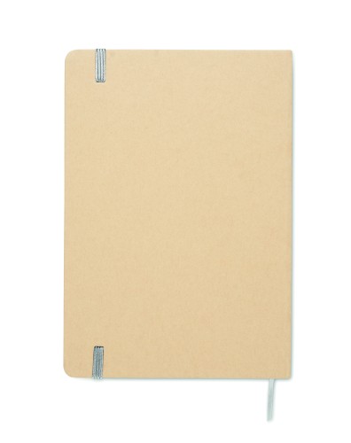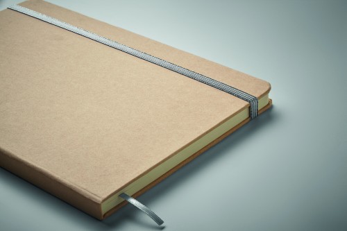 A5 notebook with hard recycled carton cover. Beige cover. Case bound. 160 lined recycled paper pages (80 sheets). Elastic closure strap, ribbon bookmark matching with revealed colour. After laser engraving the colour is revealed. FSC®-certified | FSC MIX CREDIT, P7.1, FSC-C213206