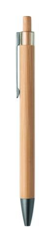 Push button pen with bamboo barrel and metal clip. Blue ink.