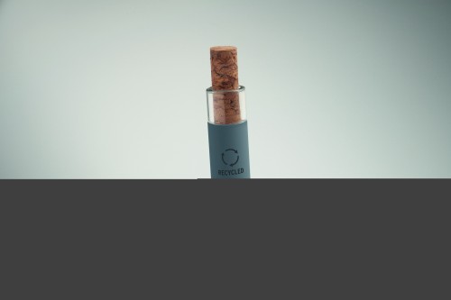 Push ball pen in recycled aluminium with cork detail button and metal clip. Blue ink.