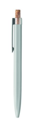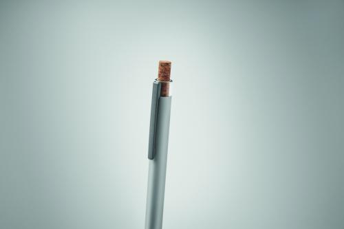 Push ball pen in recycled aluminium with cork detail button and metal clip. Blue ink.