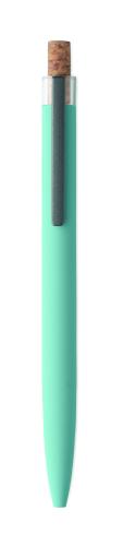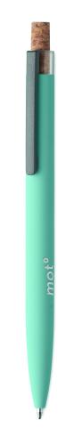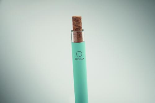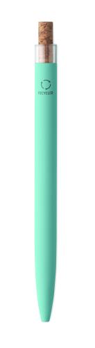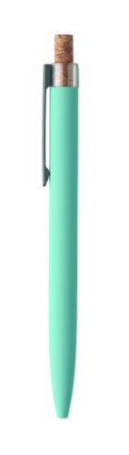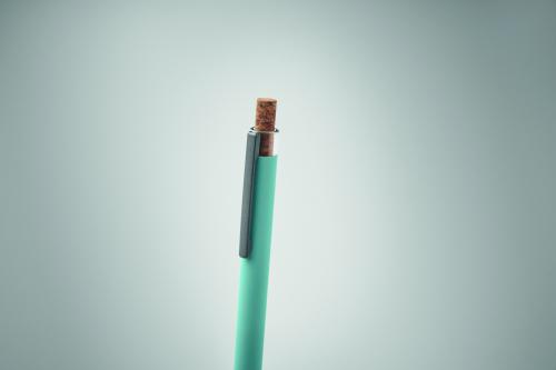Push ball pen in recycled aluminium with cork detail button and metal clip. Blue ink.