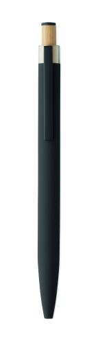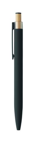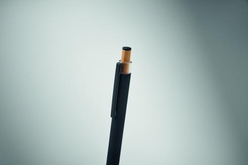 Recycled aluminium push ball pen with bamboo button with matching colour detail and matching metal clip. Blue ink.