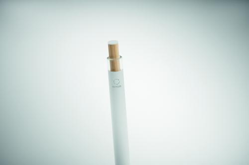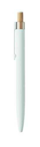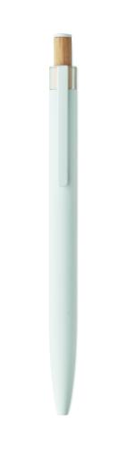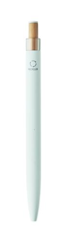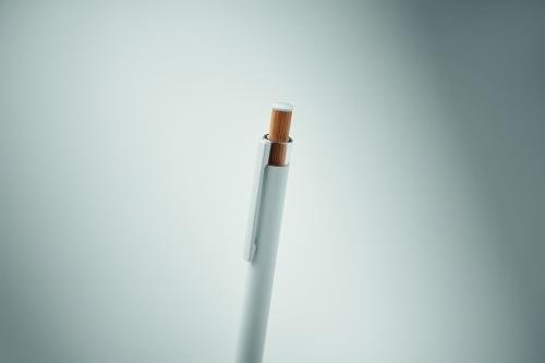 Recycled aluminium push ball pen with bamboo button with matching colour detail and matching metal clip. Blue ink.
