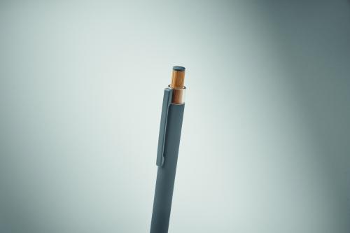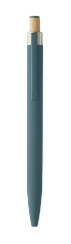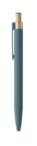 Recycled aluminium push ball pen with bamboo button with matching colour detail and matching metal clip. Blue ink.