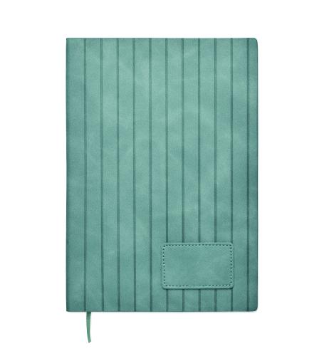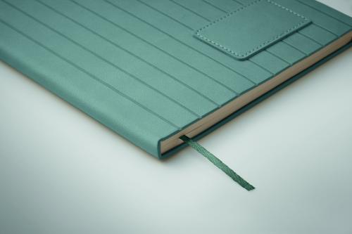 A5 notebook with soft smokey PU ribbed cover in 40% recycled post consumer and 60% PU with plain PU patch. 160 lined pages, 70gsm recycled paper (80 sheets). Matching colour polyester ribbon page marker. FSC®- certified | FSC MIX CREDIT, P7.1, FSC-C213206